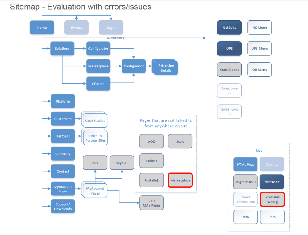 After evaluating customer segments, product offerings and their classifications along with performing competitive analysis, we collectively reviewed and refined the information into logical groupings which made sense in the inventory and logistics marketplace. It was difficult to sell re-classification and rebranding of certain product names as Sales and Marketing had grown accustomed to the naming conventions, however, once the final organization of product offerings were presented in wireframes, diagrams and spreadsheets, the team was more easily able to “get” why we needed to clean the closets and start with a fresh sense of organization to their product and service offerings.